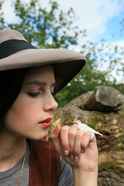 The third and final has a different bird accessory - in the form of a Tatty Devine ring I bought, after joining in with their colour-your-own acrylic pendant template activity (handily placed in the same tent as Selvedge). It was a hard call between this ring, or some swallow earrings they had on sale. Scrap that, I wanted everything there! The acrylic shapes just called out to be touched and admired and have a real sense of fun... Here I wore the ring perched on my little finger, with a grey hat. At the stall, we agreed the best way to wear it was as though the tiny bird had just alighted!